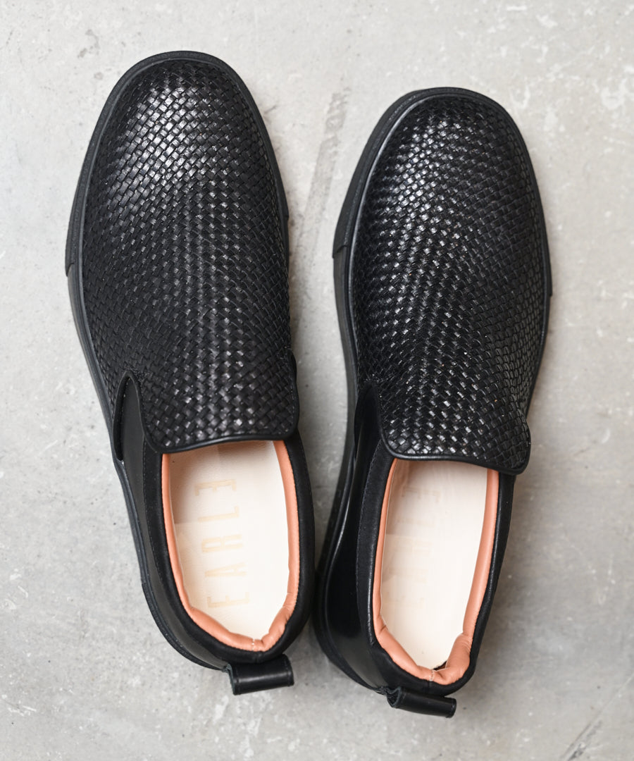 EARLEスニーカーライン定番の、レザー面を広く取ったカッティングの美しいレザースリッポンスニーカーの新しいバリエーション。